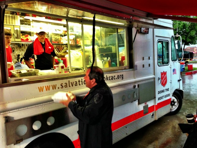 About two hours after the tornado hit, Major Steve Morris, Divisional Commander, was checking on The Salvation Army’s local church members. Upon entering the disaster site, he remembered that a soldier of the Oklahoma City Corps lived in the affected area. Concerned, he made his way to their residence to check on their health and welfare. Upon knowing all were okay, he prayed.