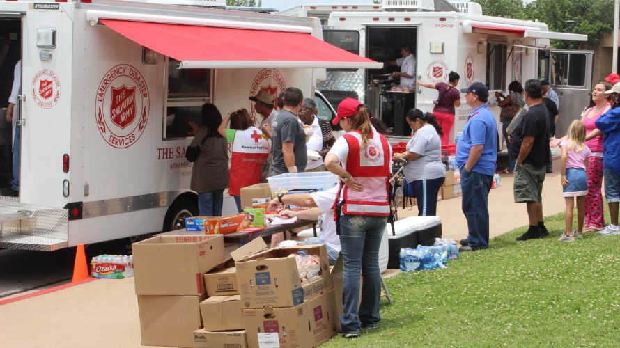 At this location, The Salvation Army is providing water, food, hygiene items, and clean-up kits for anyone affected by the recent tornadoes and flooding.