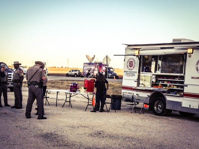 Williamson County, TX - At approximately 1 P.M. on Tuesday November 25, 2014, an Amtrak passenger train carrying over 200 passengers collided with a passenger truck occupied by a single passenger on State Highway (SH) 95 south of Bartlett, Texas. The passengers on the train were unharmed, and the train did not derail, but the collision caused the fatality of the passenger in the truck. The Salvation Army disaster team, in Williamson County, responded to a request from local Emergency Management for assistance. The passengers from the train were evacuated to the High School in Granger, Texas and were assisted by the American Red Cross before being transported to alternate transportation. Team Leader Randy O’Dell stated that “our services were needed for approximately 50 first responders at the scene”. This was no surprise to him; Randy knows that “we are there to help the first responders.” Randy and his team served about 60 sandwiches, 150 snacks, 4 cases of water, and 40 cups of coffee to the first responders.