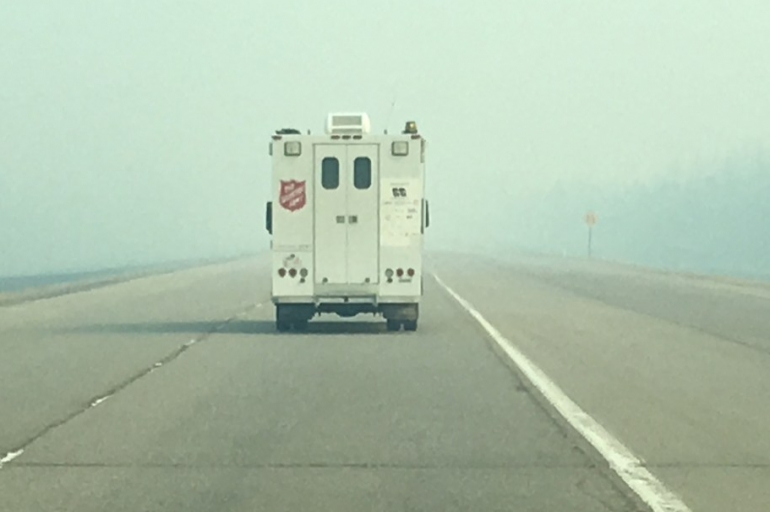 Photo: A Salvation Army disaster feeding units braves a smokey road to deliver aid to first responders and firefighters in Alberta, Canada. More photos available at via Salvation Army's international Flickr site at http://sar.my/abfires